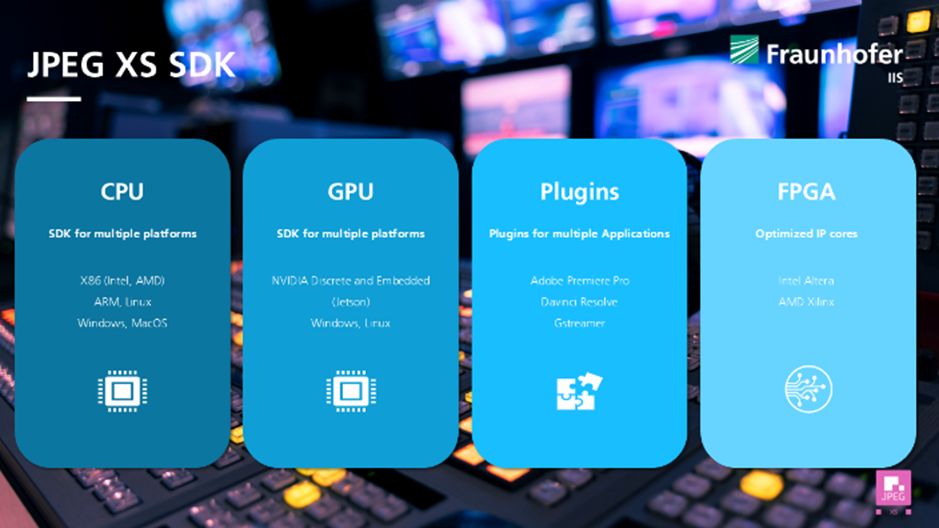 Das Fraunhofer-JPEG-XS-Team hat den Standard als extrem leistungsfähigen Codec für die hochwertige, visuell verlustfreie Videoübertragung entwickelt und dabei die Komplexität so gering wie möglich gehalten. So können sogar 8k-Produktionsbilder während der Liveübertragung über Internet-Protokoll übertragen werden. Die JPEG XS-Softwarelösungen, basierend auf dem Fraunhofer IIS JPEG XS SDK, gewinnen in professionellen Mediengeräten, Kameras und Workflows zunehmend an Bedeutung – vom Studio über die Postproduktion bis hin zur Live-Übertragung. JPEG XS kann lizensiert und in verschiedenste Hardware- und Software-Lösungen integriert werden.