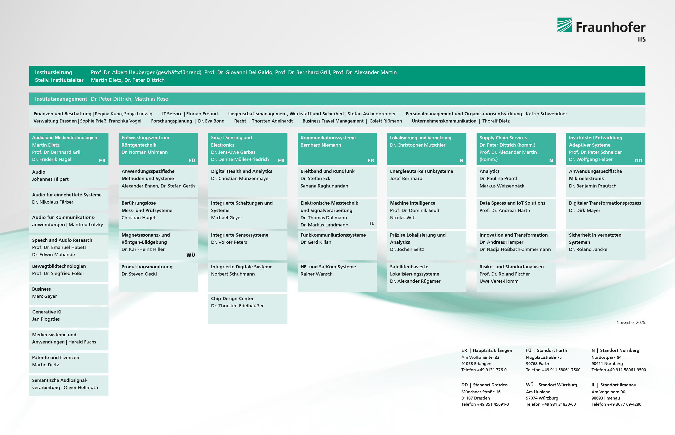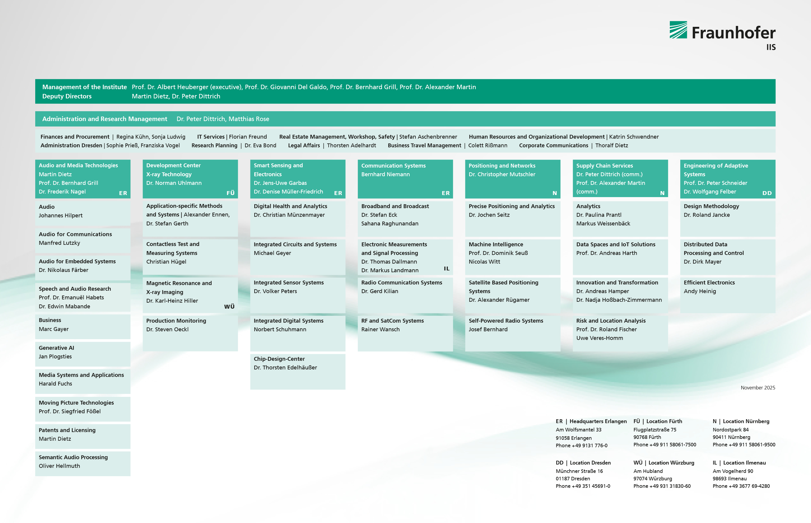 Das Fraunhofer-Institut für Integrierte Schaltungen IIS gliedert sich strukturell in nebenstehende Bereiche, diese wiederum in einzelne Abteilungen. Eine kompakte Darstellung der wissenschaftlichen Abteilungen, in denen die konkrete Arbeitsorganisation stattfindet, finden Sie auf den Abteilungsseiten.