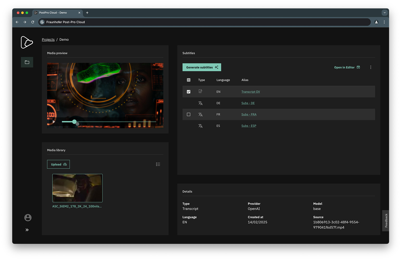 Starting with subtitle creation in the cloud with your preferred transcription service, the platform will grow to encompass speaker detection and translation services as we keep developing it to include cutting-edge generative AI features, such as speech-driven facial animation.